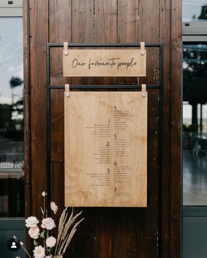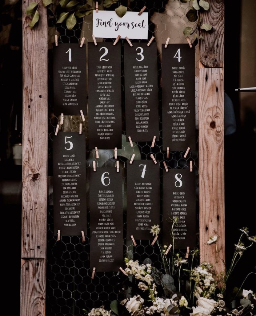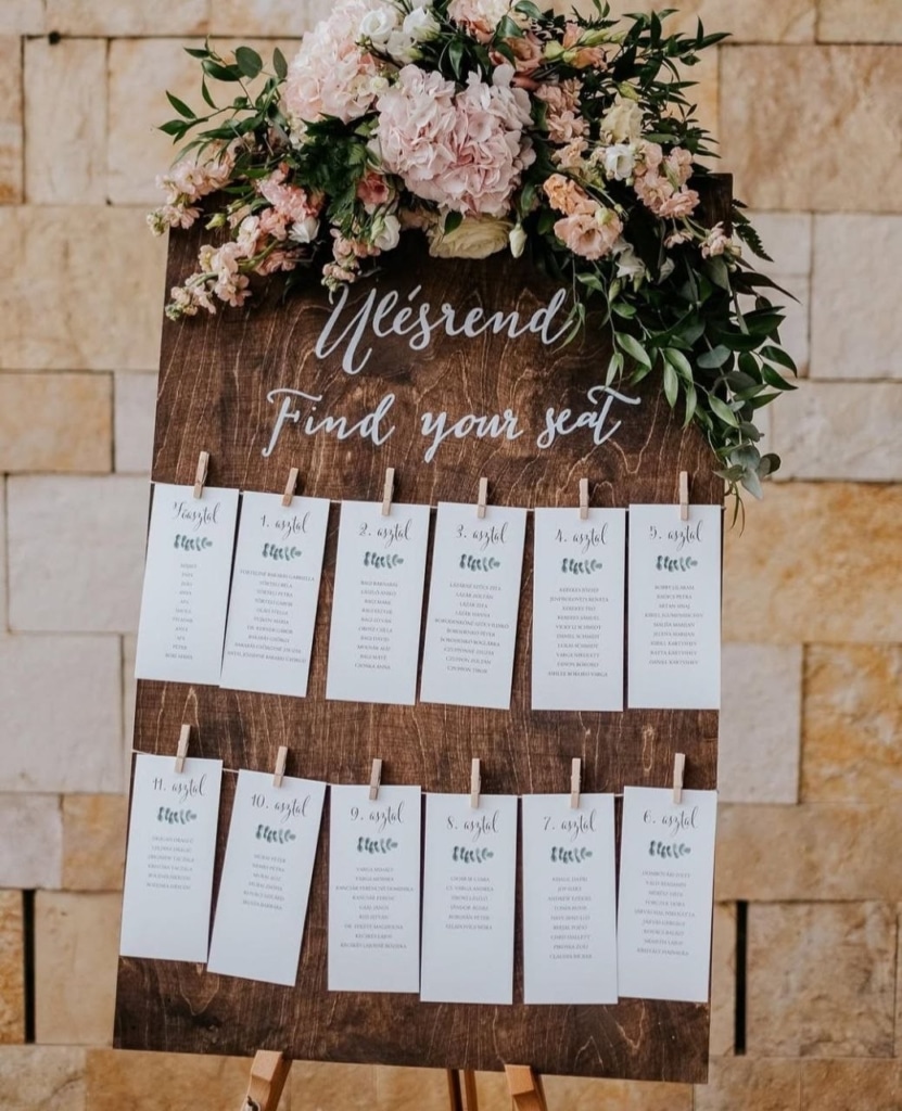 Az ülésrend egy vizuális elem. Nem csupán funkcionális, hanem kiemelt dekorációs pont is lehet! Ahogy a képeken is látszik, ez a tábla az egyik első dolog, amit a vendégek meglátnak, amikor belépnek a vacsora helyszínére. Használjátok ki a lehetőséget, hogy illeszkedjen az esküvő stílusához és hangulatához.