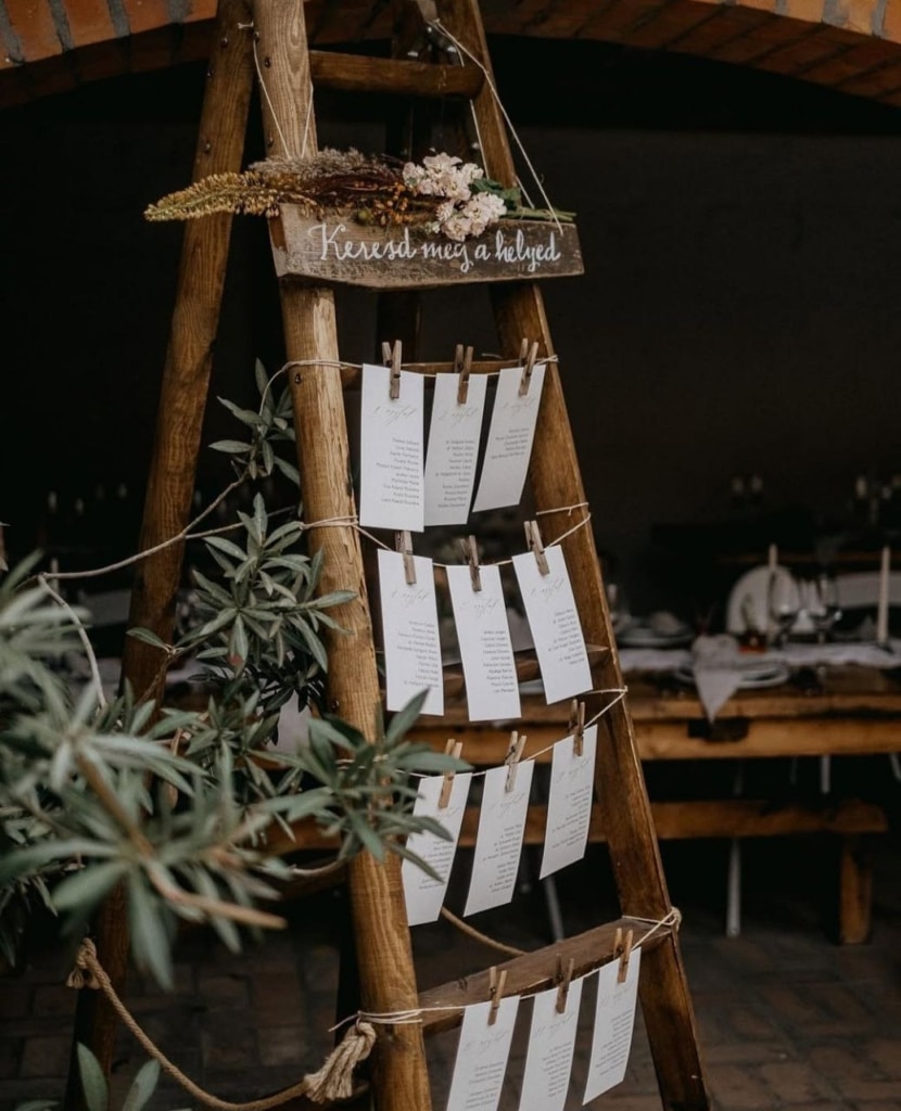 Tipp a költséghatékonysághoz: A nagy méretű, egyedi ülésrend tartók (festőállványok, fa keretek, létrák, raklapok) beszerzése drága lehet, és utána tárolni kell. Érdemes megfontolni a dekoráció bérlését, mivel ez sokkal ésszerűbb és pénztárcabarát megoldás. Ha érdekel, miért a bérlés a legokosabb befektetés a dekoráció terén, olvasd el cikkünket: Az olcsó esküvői dekoráció igazi költsége.